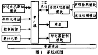 本系統(tǒng)主要以單片機總控制為核心,由微弱聲音放大檢測、可見光檢測、步進電機旋轉(zhuǎn)熱釋電紅外傳感器、A/D轉(zhuǎn)換、液晶顯示等模塊以及控制電路組成。系統(tǒng)框圖如圖1所示。