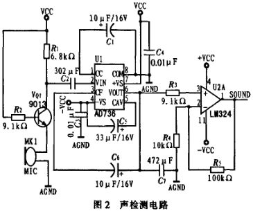 從麥克風接收到信號后由三極管9013初次放大,然后由集成放大器LM324的兩級放大,得到交流電壓。由于模數(shù)轉(zhuǎn)換時需要直流電壓值,所以再通過萬用表交直流轉(zhuǎn)換電路,選用整流芯片AD736,使用單電壓供電低阻抗電路。