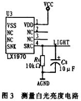 可見光檢測模塊采用LX1970作為核心芯片。LX1970是美國微型半導體(Microsemi)公司推出的一種能實現(xiàn)人眼仿真的集成化可見光亮度傳感器。該模塊采用測量白光亮度電路(如圖3)。利用src端輸出光-流轉(zhuǎn)換的結果,然后實現(xiàn)流壓轉(zhuǎn)換。該芯片性能穩(wěn)定,靈敏度極高。
