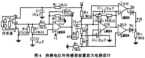 熱釋電紅外傳感器能以非接觸形式檢測出人體輻射的紅外線,并將其轉(zhuǎn)變?yōu)殡妷盒盘?。本設計所采用的是PIR熱釋電傳感器,安裝有菲涅爾透鏡,感應距離7 m,感應角度110°。具有全自動感應、光敏控制、兩種觸發(fā)方式(不可重復觸發(fā)方式,可重復觸發(fā)方式)、靈敏度高、微功耗等特點。當人進入其感應范圍,則輸出高電平,人離開感應范圍,則自動延時關閉高電平,輸出低電平。但是該熱釋電紅外傳感器只能檢測到動態(tài),所以對于長時間處于相對靜態(tài)的存在無法檢測的缺陷。熱釋電紅外傳感器前置放大電路如圖4所示。