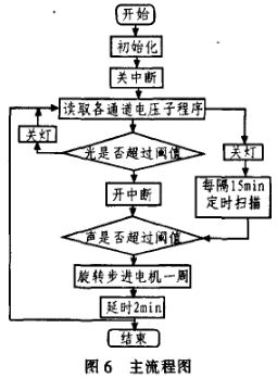 本系統(tǒng)以單片機AT89S52為核心,采用光照檢測、聲控以及步進電機旋轉(zhuǎn)熱釋電紅外等傳感器進行環(huán)境探測。系統(tǒng)首先啟動可見光模塊,通過光一流一壓轉(zhuǎn)換后,經(jīng)過A/D轉(zhuǎn)化為數(shù)字量并通過液晶顯示。若是電壓較小,說明了亮度不夠,則繼續(xù)檢測聲音。若是聲音較大,則在短時間內(nèi)調(diào)用步進電機模塊,檢測是否有人;否則,每隔15 min定時檢測。因為在實際過程中,設置聲光的閾值都缺乏直觀性,所以使用液晶電壓顯示進行判斷。光、聲的閾值可以根據(jù)不同地方的實際情況通過軟件進行調(diào)整。