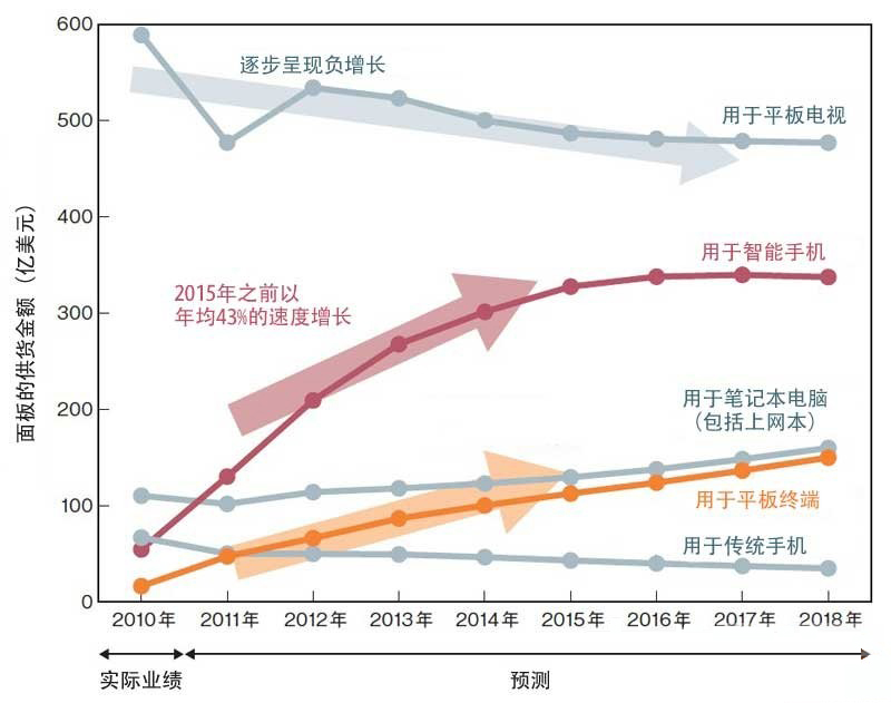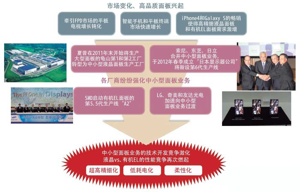 日韓臺的面板廠商開始將業(yè)務重心從電視機用大型面板轉(zhuǎn)向智能手機和平板終端使用的中小型面板。今后,技術開發(fā)競爭將越來越激烈。