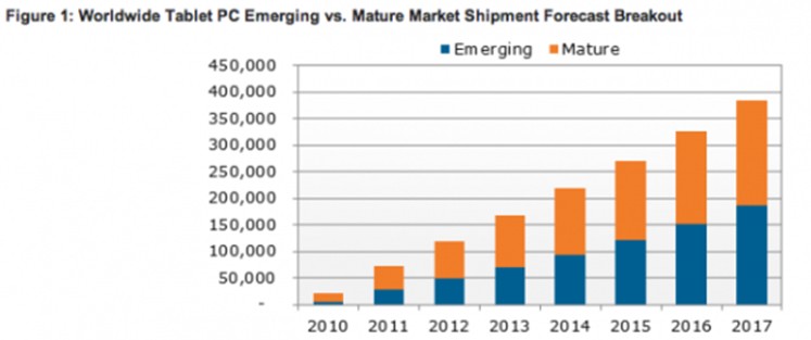 雖然那些數(shù)據(jù)本身就已十分驚人,但更令人關(guān)注的是,大多數(shù)新增的銷量將主要來自新興市場。預(yù)計(jì)到2017年,新興市場上平板電腦的銷量所占份額將由2011年的36%上升到到46%。