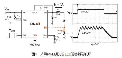無(wú)論LED是經(jīng)由降壓、升壓、降壓/升壓或線性穩(wěn)壓器驅(qū)動(dòng),連接每一個(gè)驅(qū)動(dòng)電路最常見的線程就是須要控制光的輸出。現(xiàn)今僅有很少數(shù)的應(yīng)用只需要開和關(guān)的簡(jiǎn)單功能,絕大多數(shù)都需要從0~100%去微調(diào)亮度。目前,針對(duì)亮度控制方面,主要的兩種解決方案為線性調(diào)節(jié)LED的電流(模擬調(diào)光)或在肉眼無(wú)法察覺的高頻下,讓驅(qū)動(dòng)電流從0到目標(biāo)電流值之間來(lái)回切換(數(shù)字調(diào)光)。利用脈沖寬度調(diào)變(PWM)來(lái)設(shè)定循環(huán)和工作周期可能是實(shí)現(xiàn)數(shù)字調(diào)光的最簡(jiǎn)單的方法,原因是相同的技術(shù)可以用來(lái)控制大部分的開關(guān)轉(zhuǎn)換器。