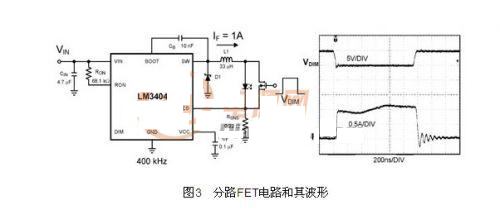 從一個(gè)沒有輸出電容器的快速降壓穩(wěn)壓器著手,出現(xiàn)在輸出電流開啟和關(guān)閉的延遲,是來(lái)自集成電路本身的傳導(dǎo)延遲和輸出電感器的物理特性。若要達(dá)到真正高速的PWM調(diào)光,兩個(gè)延遲都須被略過(guò)(By Pass)。要實(shí)現(xiàn)這個(gè)目標(biāo),最佳方法就是采用一個(gè)與LED并聯(lián)的電源開關(guān)(圖3)。當(dāng)LED關(guān)閉時(shí),驅(qū)動(dòng)電流便會(huì)分流通過(guò)開關(guān),作用就如同一個(gè)典型的N型金屬氧化半導(dǎo)體場(chǎng)效晶體管(N-MOSFET),這時(shí)集成電路會(huì)繼續(xù)運(yùn)行,而電感器電流也會(huì)持續(xù)流動(dòng)。該方法的最大缺點(diǎn)在于LED關(guān)閉時(shí),即使期間的輸出電壓下降到與電流感測(cè)電壓相同,仍會(huì)浪費(fèi)功率。