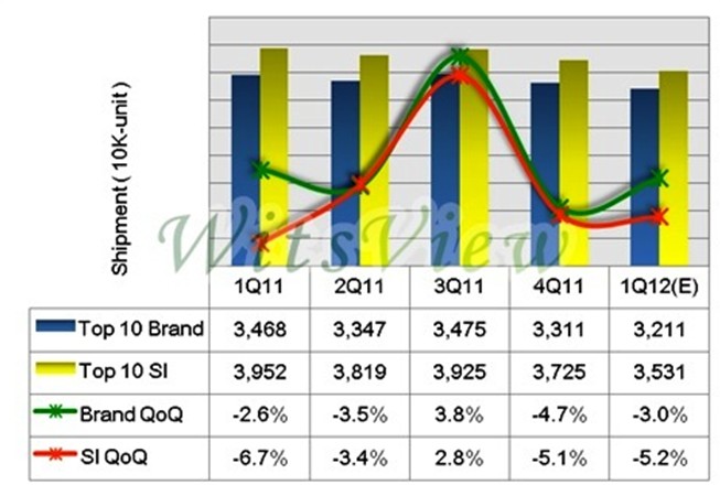 WitsView表示,衰退主因?yàn)?2011年第四季部分需求提前于第三季底反應(yīng),而終端銷售受到歐洲債信風(fēng)暴持續(xù)發(fā)酵,以及全球經(jīng)濟(jì)動能復(fù)蘇遲緩的影響,通路拉貨力道無法延續(xù);其次,面板價(jià)格雖于第四季止跌,但在終端需求疲軟下,反彈動能受到壓抑,使得品牌及通路商無提前備貨需要;再者,部份2012中國春節(jié)需求提前至2011第四季反應(yīng),但多數(shù)代工及品牌廠考量年底的庫存盤點(diǎn)壓力,而必須進(jìn)行庫存水位與出貨的調(diào)整。