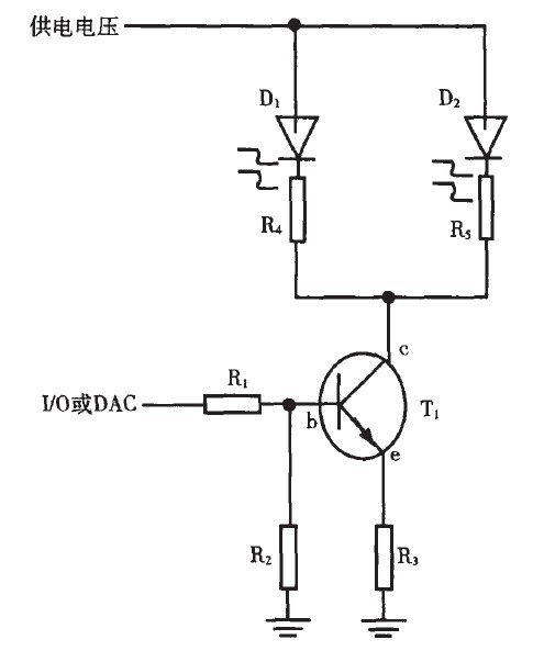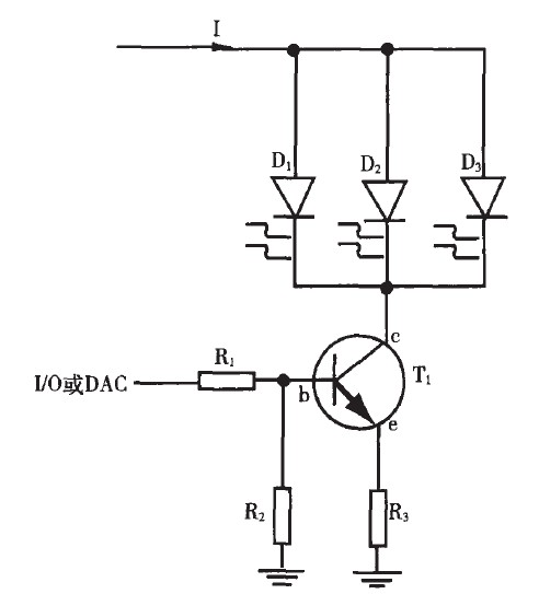 圖中, D1, D2, D3 為發(fā)光二極管, T1 為NPN 型三極管, R1 , R2 , R3 的阻值可根據(jù)總電流I 的設(shè)計要求進(jìn)行調(diào)節(jié), I/O 或DAC 為控制端口。