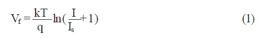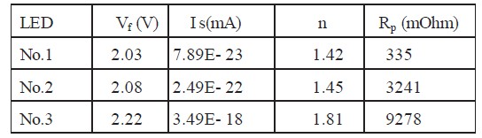 式中: I 為正向電流;n 為理想因子;k 為玻爾茲曼常數(shù)(1.38x10- 23 J /K) ; T 為溫度( 298K 或25℃) ;q 為電子電量( 1.602x10- 19 C) ;Is 為飽和電流; R 為寄生電阻;本文以西鐵成公司的發(fā)光二極管為例, 其特性參數(shù)如表1 所示。