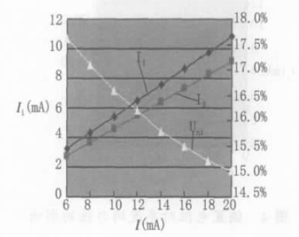 根據(jù)式(2),也可以通過改變LED 的發(fā)光亮度來改善LED 背光源的亮度均勻性,即通過改變系統(tǒng)的總電流來改善亮度的均勻性。本文討論兩個LED并聯(lián),且外加68Ω偏置電阻的情況,結(jié)果如表3 及圖6 所示。