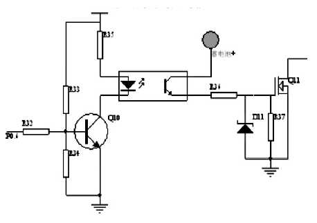 為了在夜間不同時(shí)刻采用不同的亮度,以達(dá)到節(jié)約電能的目的,本系統(tǒng)設(shè)計(jì)了兩路負(fù)載輸出,晚上12點(diǎn)以前兩盞LED皆亮,12點(diǎn)后一盞點(diǎn)亮,每路輸出均有立的控制和檢測(cè)。設(shè)計(jì)采用了PWM功率控制功能對(duì)LED燈具實(shí)現(xiàn)無(wú)級(jí)調(diào)光。單路原理如圖3所示。其中單片機(jī)P0.6 口給出控制信號(hào), 即P 0 . 6 = 1 時(shí), 三極管導(dǎo)通,繼電器閉合,MOS管導(dǎo)通,蓄電池向路燈供電。在電量不足或白天時(shí),控制端輸出低電平信號(hào),切斷供電回路。夜晚蓄電池電量不足情況下由市電供電系統(tǒng)給LED路燈供電,保證系統(tǒng)的完整和可靠。