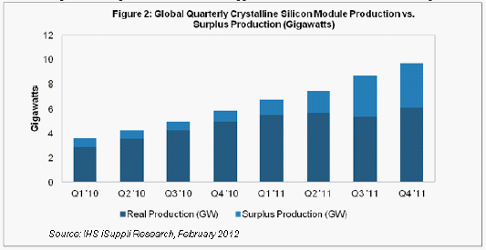 2011年光伏供應(yīng)商的過(guò)剩產(chǎn)能達(dá)到9.96GW,比2010年的3.01GW劇增231%。去年的實(shí)際需求為22.7GW,高于2010年的15.7GW。