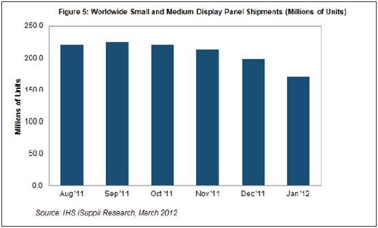 臺灣廠商的產(chǎn)能利用率從上一季度的62%降至58%,導(dǎo)致1月中小顯示器面板出貨量降至1.313億個,比2011年12月減少2900萬個。臺灣六家供應(yīng)商按出貨量降序排列:中華映管,奇美電子,瀚宇彩晶,勝華科技,友達光電和凌巨科技。