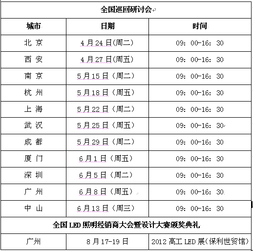 整個巡回研討會暨大賽將持續(xù)5個月時間,3月份為活動啟動宣傳階段,4-5月份為全國巡回研討及大賽報名階段,6‐8 月份為大賽作品提交及評審階段。巡回總結大會暨設計大賽頒獎典禮將于2012 高工LED 展期間(8 月17 日)在廣州保利世貿(mào)館召開。
