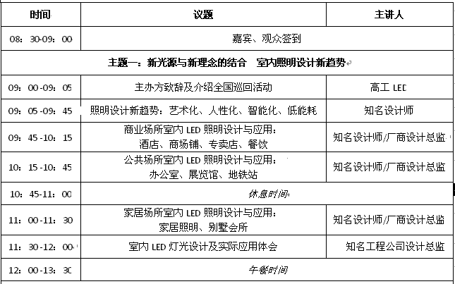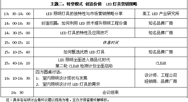 2012是高工LED的渠道年、服務年,為推廣LED照明節(jié)能產(chǎn)品,分享LED照明設計理念,增進LED照明廠商、設計師、工程商、經(jīng)銷商之間的交流與合作,推動LED燈具在家居、酒店、別墅會所、商場鋪、專賣店、餐飲、辦公、展館、地鐵站等室內(nèi)照明中的應用。高工LED將進行第三次長征(2010年全國LED產(chǎn)業(yè)調(diào)研、2011年全國燈具城調(diào)研),由高工LED、高工LED商城、《高工LED產(chǎn)品與市場》雜志聯(lián)合全國各地室內(nèi)裝飾設計協(xié)會、建筑設計機構、照明及LED行業(yè)協(xié)會共同舉辦的“2012 LED照亮中國之旅”渠道開拓活動-室內(nèi)LED照明設計全國巡回研討會暨全國室內(nèi)LED照明設計大賽,將于4‐8月在北京、西安、南京、杭州、上海、武漢、成都、廈門、深圳、廣州、中山11個重點城市舉辦。整個巡回研討會將有全國近1500名來自設計機構、工程公司、經(jīng)銷商等單位專業(yè)人士參加,活動將覆蓋超過20萬設計、工程、經(jīng)銷等各渠道群體。