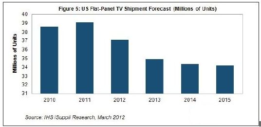 據(jù)IHS iSuppli公司的美國電視市場追蹤報(bào)告,2012年美國市場的平板電視出貨量預(yù)計(jì)降到3710萬臺,比2011年的3910萬臺減少5%。去年出貨量較2010年的3860萬臺微增1%。