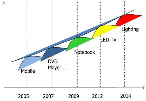 綜觀LED的發(fā)展過(guò)程,2002年起LED從小尺寸顯示器(主要應(yīng)用在手機(jī)上)開(kāi)始滲透,在2005年達(dá)到高峰。但是隨著效率的提升,單位顯示器使用的LED顆數(shù)也逐漸減少。當(dāng)手機(jī)成長(zhǎng)趨于飽和狀態(tài)下,LED總需求量便開(kāi)始下滑。在此時(shí)LED便開(kāi)始尋找下一個(gè)應(yīng)用:中尺寸顯示器。隨著性價(jià)比的不斷提升,LED于2007年在中尺寸顯示器的需求達(dá)到飽和,與先前小尺寸一樣LED需求開(kāi)始往下。LED開(kāi)始進(jìn)入到另一個(gè)應(yīng)用:筆記本電腦顯示器,并于2009年底開(kāi)始進(jìn)入電視顯示器的應(yīng)用。隨著LED在大尺寸顯示器的廣泛應(yīng)用,LED的性能已經(jīng)提升到每瓦100流明以上,而價(jià)格也快速下降,此趨勢(shì)對(duì)于LED在照明應(yīng)用的發(fā)展有著無(wú)比的助力。