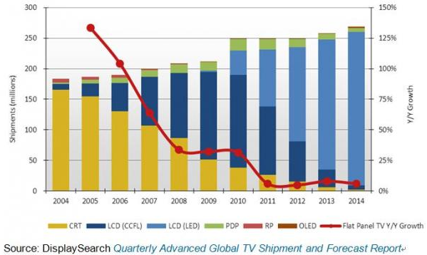 根據(jù)NPD DisplaySearch季度全球電視出貨和預(yù)測報告Quarterly Advanced Global TV Shipment and Forecast Report指出,全球電視出貨量連續(xù)兩年持平,2012年出口到西歐、日本等發(fā)達市場的電視總量預(yù)計將較去年下降11%,由此抵消了新興市場8%的年成長。盡管如此,隨著CRT和等離子電視逐步淡出市場,液晶電視將持續(xù)獲得更大市場份額。