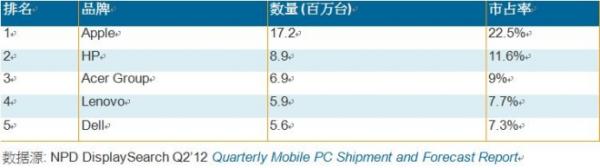 平板電腦為蘋果公司的Mobile PC出貨增溫,使得今年第一季的市占率達(dá)到22.5%,將近HP市占率的兩倍,其它前五大品牌則是由筆記本電腦出貨量決定排名。