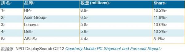 Q1 12全球前五大Mobile PC品牌出貨排名初步調(diào)查結(jié)果