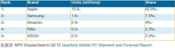 Q1 12全球前五大平板電腦品牌出貨排名初步調(diào)查結(jié)果