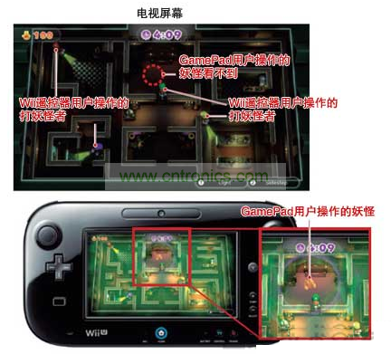 在Wii U上,只有使用GamePad的用戶,才能在看著與電視上顯示內(nèi)容不同的信息玩游戲。比如,在打妖怪的迷你游戲“Luigi’s Ghost Mansion”中,手拿GamePad的用戶操作妖怪,手拿Wii遙控器的4名用戶負(fù)責(zé)打退妖怪。此時,手拿GamePad的用戶可在該屏幕上看到負(fù)責(zé)打妖怪的卡通人物的位置,而打妖怪的人卻看不到妖怪的位置。