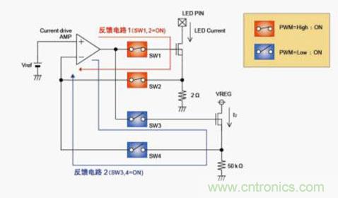 這兩條反饋通路由各SW進行切換。在PWM=High(LED為ON)區(qū)間,驅(qū)動LED電流輸出用的反饋電路(圖3反饋電路1),由LED引腳灌入LED電流。在PWM=Low(LED為OFF)區(qū)間,驅(qū)動另一條反饋電路(圖3反饋電路2),由內(nèi)部恒定電壓VREG產(chǎn)生電流。通過進行這樣的控制,LED電流雖然是關(guān)斷的,但電流驅(qū)動放大器始終處于驅(qū)動狀態(tài),PWM=Low→High時可平穩(wěn)生成LED電流。由于反饋通路2的電流I2已設(shè)定為數(shù)μA,因此,本電路結(jié)構(gòu)的功耗增加量已達到可以忽視的水平。