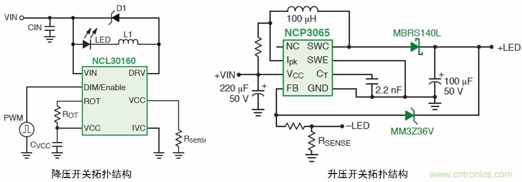 用于中等電壓通用照明的開關(guān)驅(qū)動(dòng)器有多種拓?fù)?,如降壓、升壓;降?升壓的NCP3065和NCP3066(可以配置為控制器)、NCP3163、MC33163、NCP1294;降壓的CAT4201、NCP1034、NCL30100、NCL30105、NCL30160、NCL30161;此外還有升壓或SEPIC的CS5171/3。