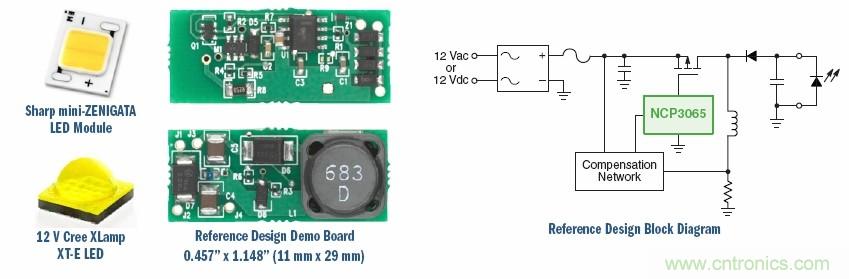 對(duì)于3至4個(gè)LED模塊的12 V AC-DC設(shè)計(jì),可以使用安森美半導(dǎo)體針對(duì)NCP3065的評(píng)估板NCP3065BBGEVB,用來驅(qū)動(dòng)12 Vac/Vdc應(yīng)用中的夏普ZENIGATA™、Cree XLamp™MC-E及其他LED模塊。其特點(diǎn)是小尺寸、寬輸入和輸出工作電壓,輸出電流經(jīng)過穩(wěn)流,還具有LED開路保護(hù)、輸出短路保護(hù)能力。該解決方案適用于MR16燈泡、景觀照明、交通照明。