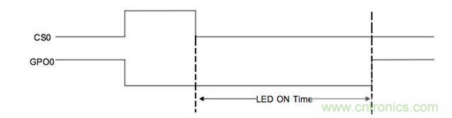 通常對(duì)于電容式按鍵來說,LED直接位于按鍵之下,從中心位置發(fā)光。用戶手指放在按鍵上,LED就會(huì)被隱藏起來。在此情況下,如果用戶手剛從按鍵上拿開LED燈就馬上關(guān)閉,那么用戶可能難以確定按鍵操作到底成功沒有。為此,我們可以讓LED在觸摸結(jié)束后保持“開啟”一小段時(shí)間,從而為用戶提供更好的視覺反饋。這種特性就叫LED開啟時(shí)間,如圖2所示。