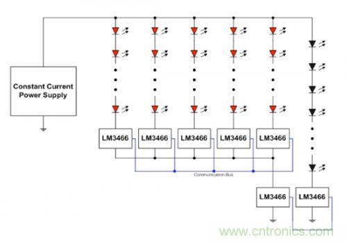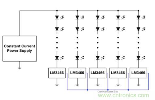 在本應(yīng)用中,LM3466 集成電路可互相通信,確保恒定電流電源所強加的輸入電流能夠在各串之間進(jìn)行平均分配。線性穩(wěn)壓器會吸收 LED 堆棧正向電壓的任何差異。
