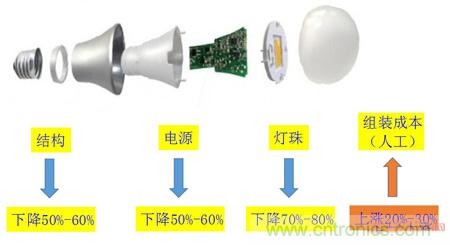 從上圖表示,LED光源產(chǎn)品無論是從結(jié)構(gòu),電源還是燈珠,成本都有大幅下降至少50%,然而人工組裝成本卻漲幅近20%-30%。晶豐明源銷售總監(jiān)李寧在第六屆華強(qiáng)國際LED照明市場戰(zhàn)略暨創(chuàng)新技術(shù)研討會上表示:“晶豐明源將持續(xù)提供更高性價比的整體電源方案來提高客戶的競爭力,其次,實現(xiàn)全自動化生產(chǎn),提高效率,從而幫助客戶降低人工成本。”
