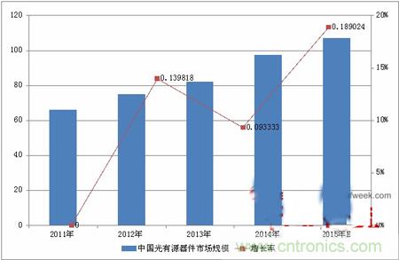 據(jù)OFweek行業(yè)研究中心出版的《2015-2018年中國光有源器件市場分析及前景預測報告》顯示,2011年-2014年中國光有源器件市場規(guī)模增長較快,年復合增長率達到14%。未來幾年會有所放緩,年復合增長率會降至10%左右。2014年中國光有源器件市場規(guī)模為97.5億元人民幣,估計2015年將達到107億元。