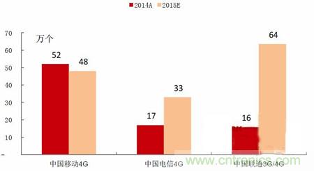 圖表3 2014、2015年三大運營商新增4G基站數(shù)量(單位:萬個)