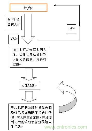 系統(tǒng)初始化之后,對狀態(tài)進(jìn)行判斷,若沒檢測到人,則一直處于檢測狀態(tài);若檢測到有人,則單片機(jī)控制IO口打開開關(guān)使得LED射燈發(fā)光照射到人體,攝像頭開始捕捉人體位置信息,并進(jìn)行定位;當(dāng)人體移動時,單片機(jī)控制系統(tǒng)對熱釋電和攝像頭傳回來的信號進(jìn)行處理,對人體重新進(jìn)行定位,并且控制云臺轉(zhuǎn)動使射燈跟隨人體運(yùn)動;當(dāng)人體再移動,便繼續(xù)“人體移動----數(shù)據(jù)處理---轉(zhuǎn)動云臺”這個循環(huán)過程。