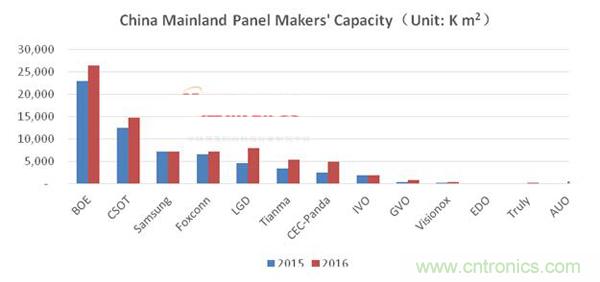 圖二:中國大陸面板廠商2015-2016年產(chǎn)能變化情況
