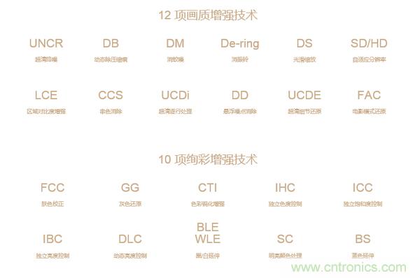 當(dāng)然,它也關(guān)畫質(zhì)有那么一點(diǎn)事。因?yàn)榇蟛糠值碾娨旳RM芯片也都集成了畫質(zhì)引擎技術(shù),比如下圖所出現(xiàn)的,有百分之九十的人都不會看完的各種高大上的技術(shù)術(shù)語。不要以為這些技術(shù)很牛,是電視廠商搞出的什么新鮮玩意兒,其實(shí)這只是一個(gè)多合一芯片集成了所有的接口,也就是說只要是同一芯片方案的電視機(jī)連底層程序都是一樣的,沒有絲毫的獨(dú)特性。
