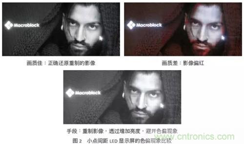 在室內(nèi)應(yīng)用中,LED顯示屏的亮度多介于300到1000尼特(nit),將此亮度轉(zhuǎn)換成LED順向電流,約當(dāng)于1~5mA,甚至小于1mA。因此,驅(qū)動(dòng)芯片的小電流集中度變得很重要。當(dāng)驅(qū)動(dòng)芯片電流精度不佳,小點(diǎn)間距LED顯示屏就容易出現(xiàn)區(qū)塊不均的色塊,然而為掩飾色塊這個(gè)缺陷,通常會(huì)采取提高LED電流這個(gè)手段,來增加顯示屏的亮度。但帶來的缺點(diǎn)是,當(dāng)觀眾注視這個(gè)LED顯示屏一段時(shí)間后,眼睛容易感覺不適。圖1所演示的是小點(diǎn)間距LED顯示屏,在使用不同質(zhì)量的LED驅(qū)動(dòng)芯片時(shí),重制圖像后的實(shí)際差異。