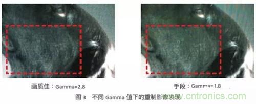 如果不采用提高LED順向電流的方式來掩蓋上述的缺點(diǎn),另一種手段就是調(diào)整小點(diǎn)間距LED顯示屏的gamma曲線,灰階的亮度對(duì)于正確的影像重制是非常重要,因?yàn)樵谝曈嵲粗辛炼劝舜蟛糠莓嬅鏀?shù)據(jù)。如圖3,右邊的圖像gamma值較小,代表中間色調(diào)的亮度太高,因此,整體畫面刷白又缺少深度,圖像上的細(xì)節(jié)損失不少,相較于左圖,右圖中的狗毛沒有那么有層次。