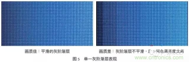 小點(diǎn)間距LED顯示屏為時(shí)序掃描式(multiplexed)的顯示器,非液晶屏幕的hold-type顯示器,所以刷新率對(duì)于小點(diǎn)間距LED顯示屏來說相當(dāng)?shù)刂匾?,較低的刷新率不僅會(huì)使小點(diǎn)間距LED顯示屏觀賞起來有閃爍的不適感,容易使造成觀賞者暈炫,而且會(huì)使灰階漸層的效果不平滑。以圖4為例,右圖臉部的灰階漸層效果較左圖的不平滑,有類似等高線的現(xiàn)象,從圖5的灰階漸層測試畫面也可以看出右圖的小點(diǎn)間距LED顯示屏的連續(xù)性比左圖的差。