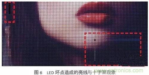 現(xiàn)今的LED磊晶與封裝技術(shù)與日俱增,但LED經(jīng)過長時(shí)間的使用后仍難免會(huì)有損壞,與液晶屏幕不同的是,壞掉的LED會(huì)在小點(diǎn)間距LED顯示屏形成亮線或是十字架,而不是一個(gè)黑點(diǎn),如圖6所示。對(duì)LED顯示屏制造商,營運(yùn)商與觀眾而言,都是一大困擾。