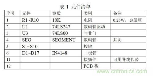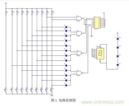 如圖1所示,電路由與非門74LS00、數(shù)碼管驅(qū)動(dòng)芯片74LS247組成。10個(gè)按鍵組成輸入電路,經(jīng)過與非門電路編碼后,輸入數(shù)碼管驅(qū)動(dòng)芯片,驅(qū)動(dòng)數(shù)碼管顯示相應(yīng)的按鍵號(hào)。