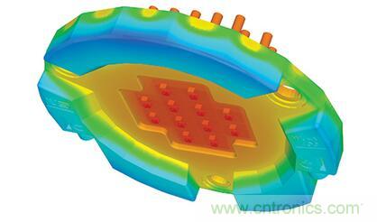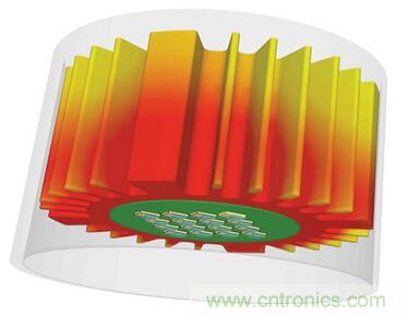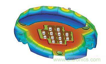 LED燈具設計師所面臨的挑戰(zhàn)是如何將所有這些東西都放在可用的空間中,同時確保成品內(nèi)部和外部關鍵點的溫度保持在可接受的范圍內(nèi)。這時候,熱模擬就能起到作用,特別是在整個設計過程中。圖2示出了在熱模擬下有良好散熱的芯片模塊范例。