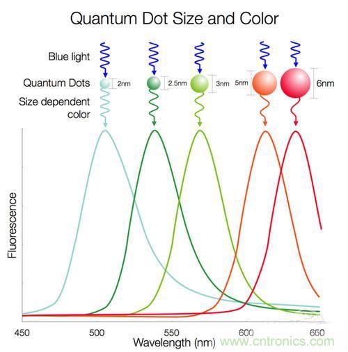 簡(jiǎn)單通俗的說,量子點(diǎn)的光電性質(zhì)與以往的發(fā)光顯示顆粒大不一樣,量子點(diǎn)因?yàn)轭w粒非常小,以納米為單位,導(dǎo)致量子點(diǎn)的顯示顏色是以改變顆粒的大小形狀而進(jìn)行改變,也正因?yàn)槿绱?,理論上來講,量子點(diǎn)顯示的色譜更具有連續(xù)性,成本也會(huì)更低。