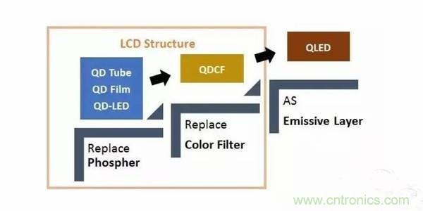 大致可以分為三個(gè)階段:一、取代傳統(tǒng)的發(fā)光熒光粉;二、去掉彩色濾光片;三正式成為發(fā)光層(也就是目前OLED的像素點(diǎn)自發(fā)光的形式)