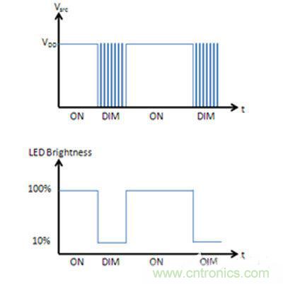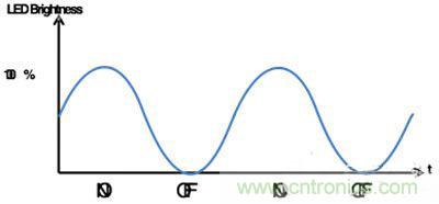 我們?cè)诒疚拈_始處通過筆記本電腦的電源鍵為例簡單介紹了一下呼吸效應(yīng)。持續(xù)地逐漸提升或逐漸下降兩級(jí)之間的占空比能讓LED形成“呼吸”的效果,如圖6所示。待機(jī)模式下電源按鍵支持呼吸效應(yīng)能告訴用戶電源按鍵是活動(dòng)狀態(tài)并能進(jìn)行操作。