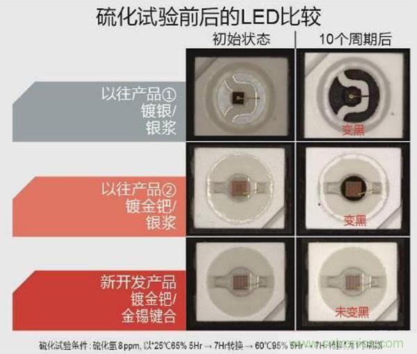 在硫化試驗(yàn)中,以往使用鍍銀框架及銀漿的產(chǎn)品的光通量在一個(gè)周期(24小時(shí))后為70%,10個(gè)周期后為60%,時(shí)間越長其光通量越低;而新產(chǎn)品可在10個(gè)循環(huán)(240小時(shí))后依然保持幾乎100%的高光通量 。