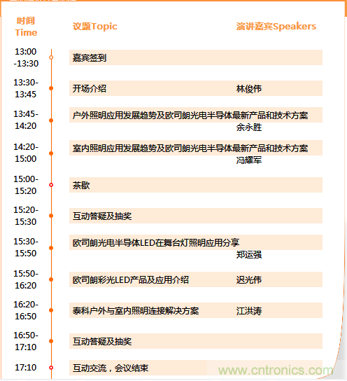 本次研討會特邀新曄電子市場總監(jiān)林俊偉、歐司朗光電半導(dǎo)體通用照明事業(yè)部市場工程師余永勝、歐司朗光電半導(dǎo)體市場部經(jīng)理馮耀軍、歐司朗光電半導(dǎo)體多元市場事業(yè)部中國區(qū)市場工程師鄭運強、歐司朗光電半導(dǎo)體通用照明事業(yè)部高級應(yīng)用工程師遲光偉、泰科工業(yè)事業(yè)部亞太區(qū)資深照明領(lǐng)域產(chǎn)品經(jīng)理江洪濤等,他們將在現(xiàn)場為大家具體解讀LED舞臺照明領(lǐng)域的最新技術(shù)進(jìn)展與市場趨勢。