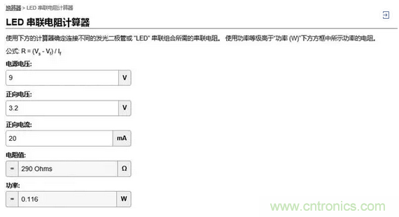 為了簡化計算,Digi-Key提供了一個LED串聯(lián)電阻計算器,幫您計算電路設計中所需要電阻的阻值和功率。