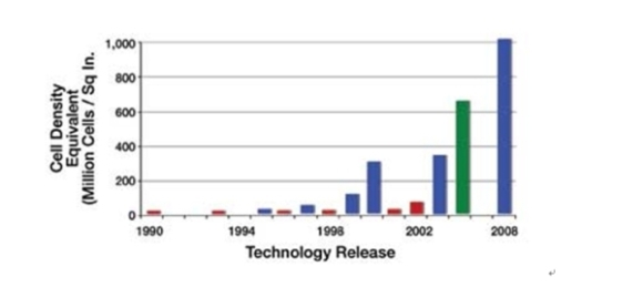 圖2顯示了Fairchild公司≤30V的N溝道MOSFET單元密度的進(jìn)步。每個條形都表示新的工藝進(jìn)步??梢钥吹?,在最近的十年中,單元密度從3200萬單元/平方英寸增加到現(xiàn)在的10億單元/平方英寸。
