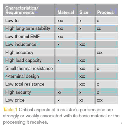 理想的電流檢測電阻應(yīng)該完全與這些參數(shù)無關(guān),當(dāng)然這樣的電阻是不存在的。實(shí)際的電阻特性見表1,包括溫度系數(shù)TCR,長期穩(wěn)定性,熱電動(dòng)勢,負(fù)載能力,電感和線性度,其中的部分特性由材料本身決定;部分特性由元件設(shè)計(jì)決定,還有一些參數(shù)決定于生產(chǎn)制程。